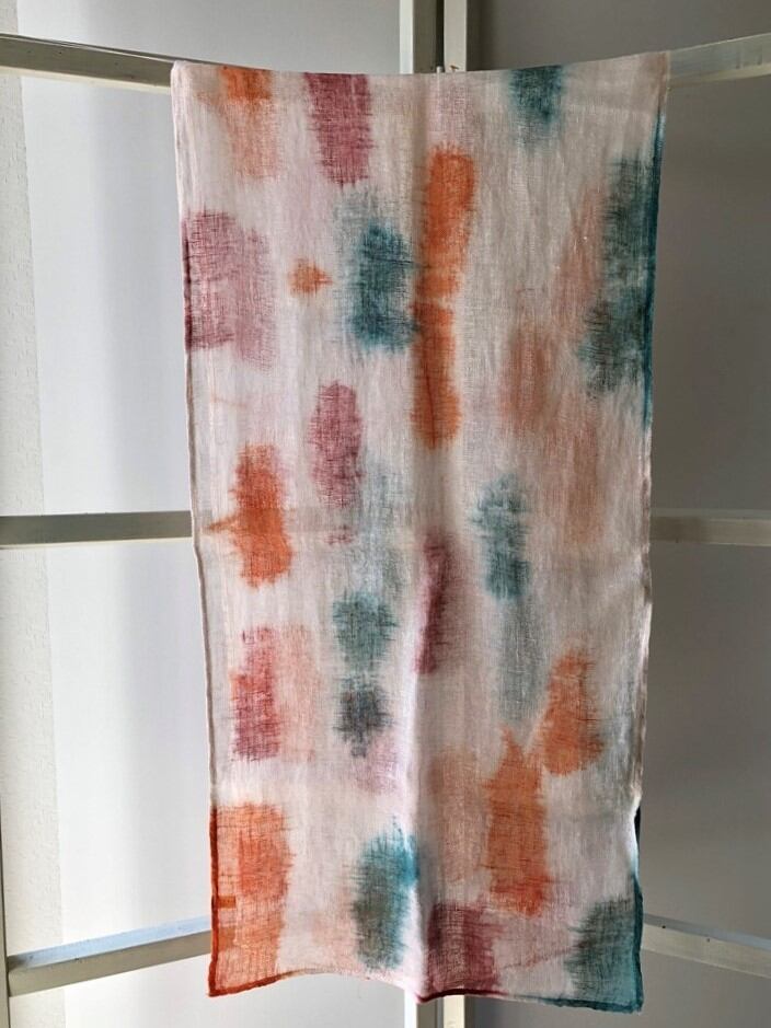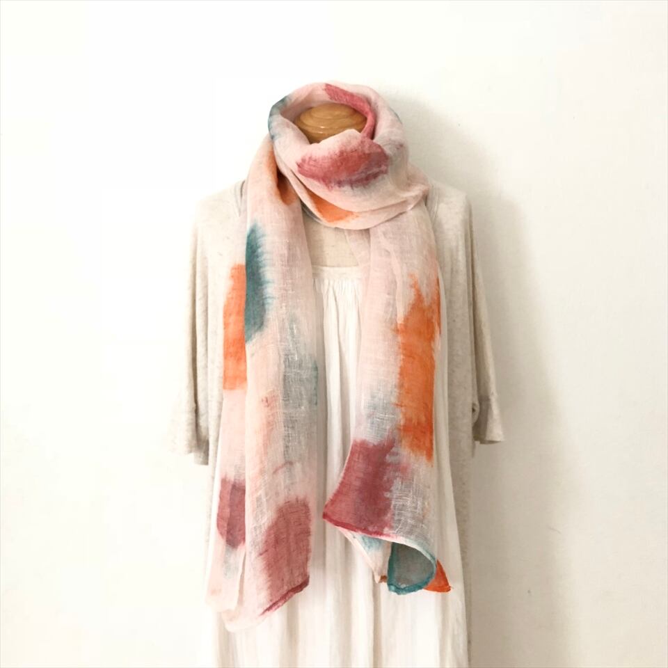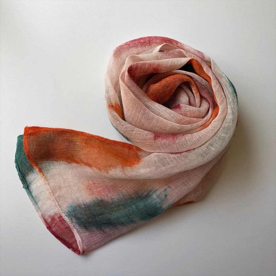 一枚一枚丁寧に手染めした一点物のリネンかやストールは薄手でとても軽いです