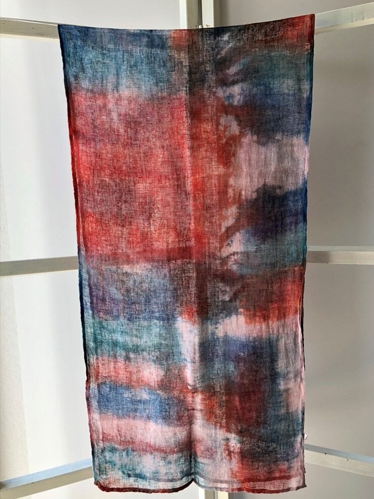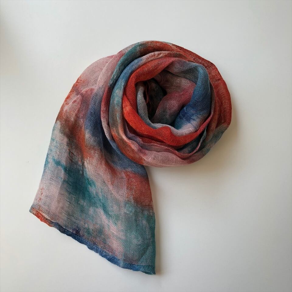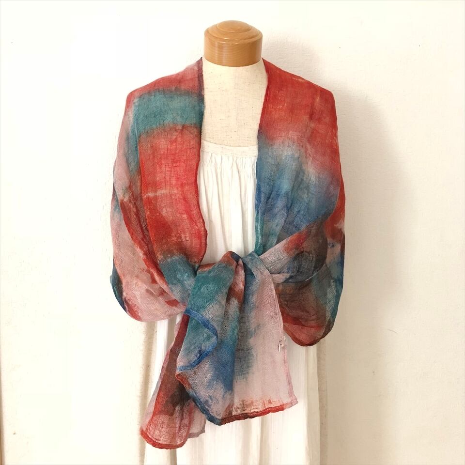 一枚一枚丁寧に手染めした一点物のリネンかやストールは薄手でとても軽いです